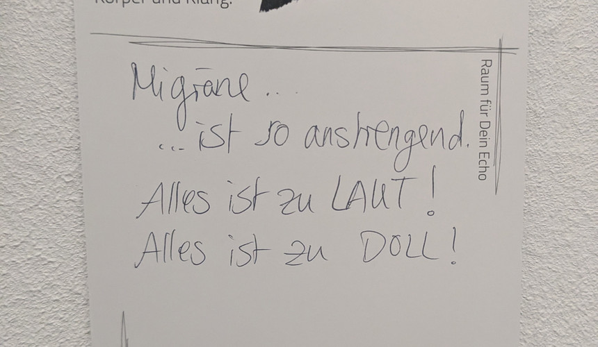 Zwölf Besucher:innen hinterließen persönliche Echos an den Wänden. Dabei hinterließen nicht nur Menschen mit Migräne, sondern auch Nichtbetroffene ihre Gedanken. Es ging um Verständnis, Wut, Dankbarkeit und gegenseitigem Zuspruch. Genau in diesen Worten steckt der Dialog, den ich mir gewünscht habe: Verständnis, Perspektivwechsel, Geteiltes. Und die Erkenntnis, wie unsichtbar Migräne im Alltag bleibt. Diese Stimmen haben mich darin bestärkt, Migräne nicht nur sichtbar zu machen, sondern erfahrbar – nicht als medizinische Erklärung, sondern als körperliche, emotionale Sensation. Als Raum, den man betritt und den man vielleicht zu schnell wieder verlassen möchte.