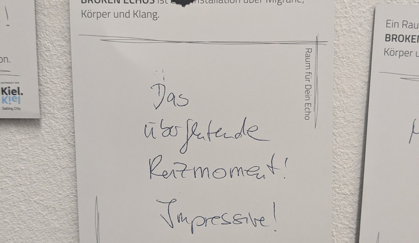 Auch organisatorisch war BROKEN ECHOS ein Lernfeld. Es gab keinen bestehenden Veranstaltungsrahmen, kein Laufpublikum, keine Strukturen, die im Hintergrund schon funktionierten. Alles musste ich selbst denken: Kommunikation, Gestaltung, Akquise, Aufbau. Zu wenig Flyer, dann zu viele; Postkarten, die zu spät ankamen; Dauerregen und Sofawetter.